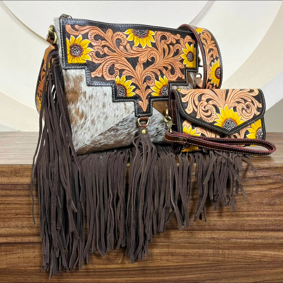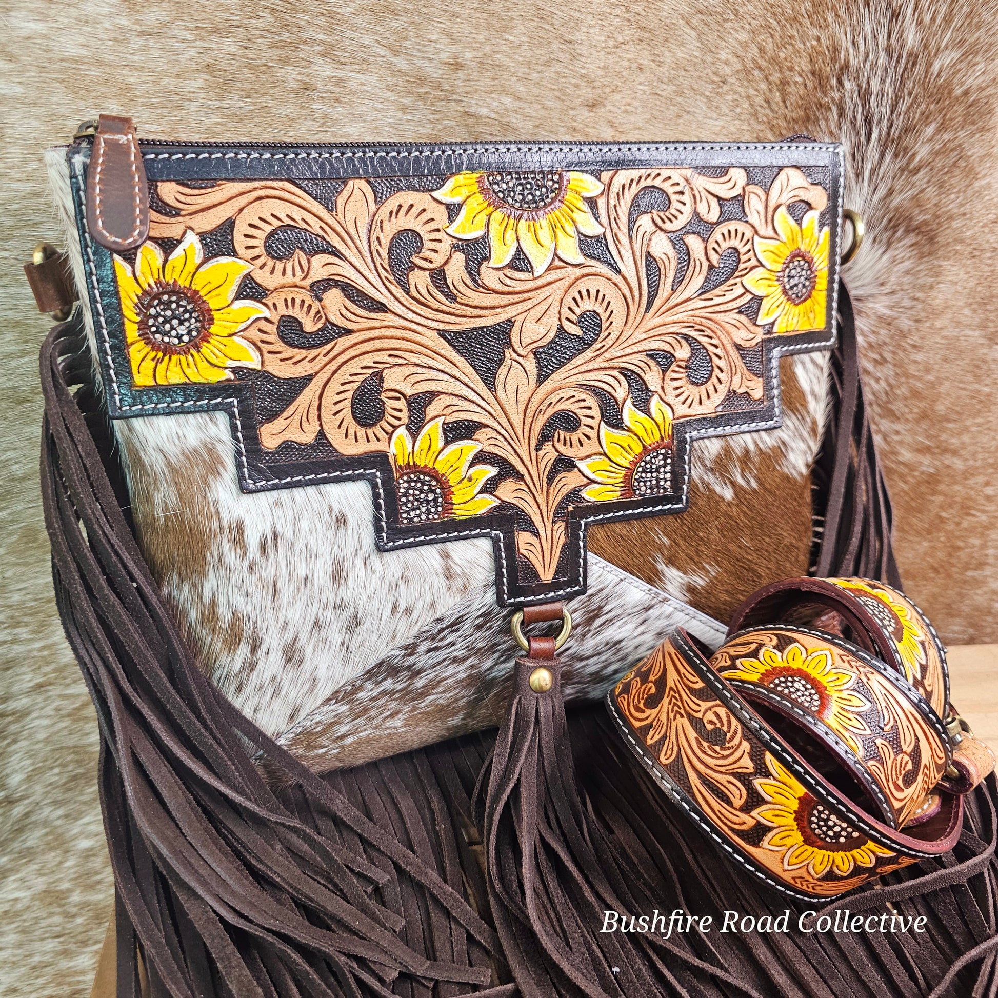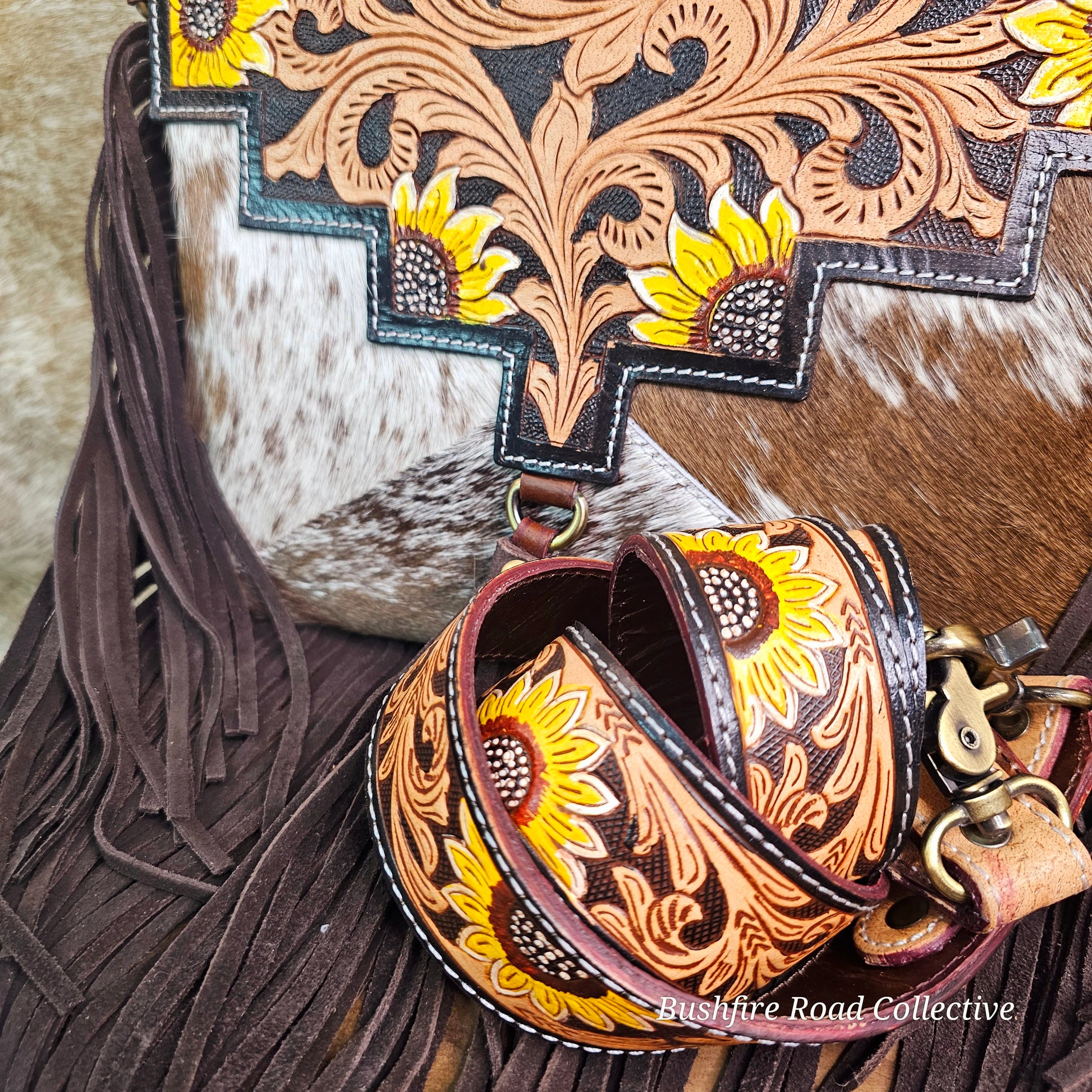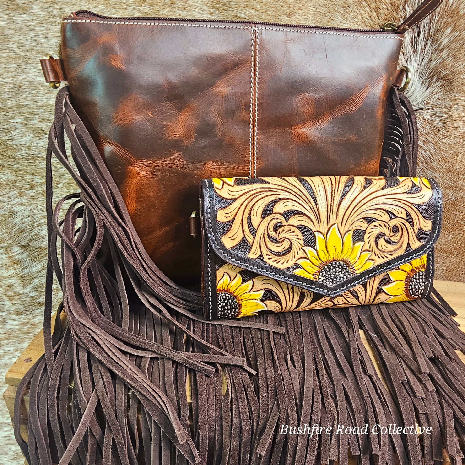 sunflower leather bag, tooled leather handbag, cowhide crossbody fringe bag, sunflower wristlet wallet, western sunflower purse set, boho western handbag, cowgirl style bag, Bushfire Road Collective leather, western fringe bag Australia, handmade western accessories