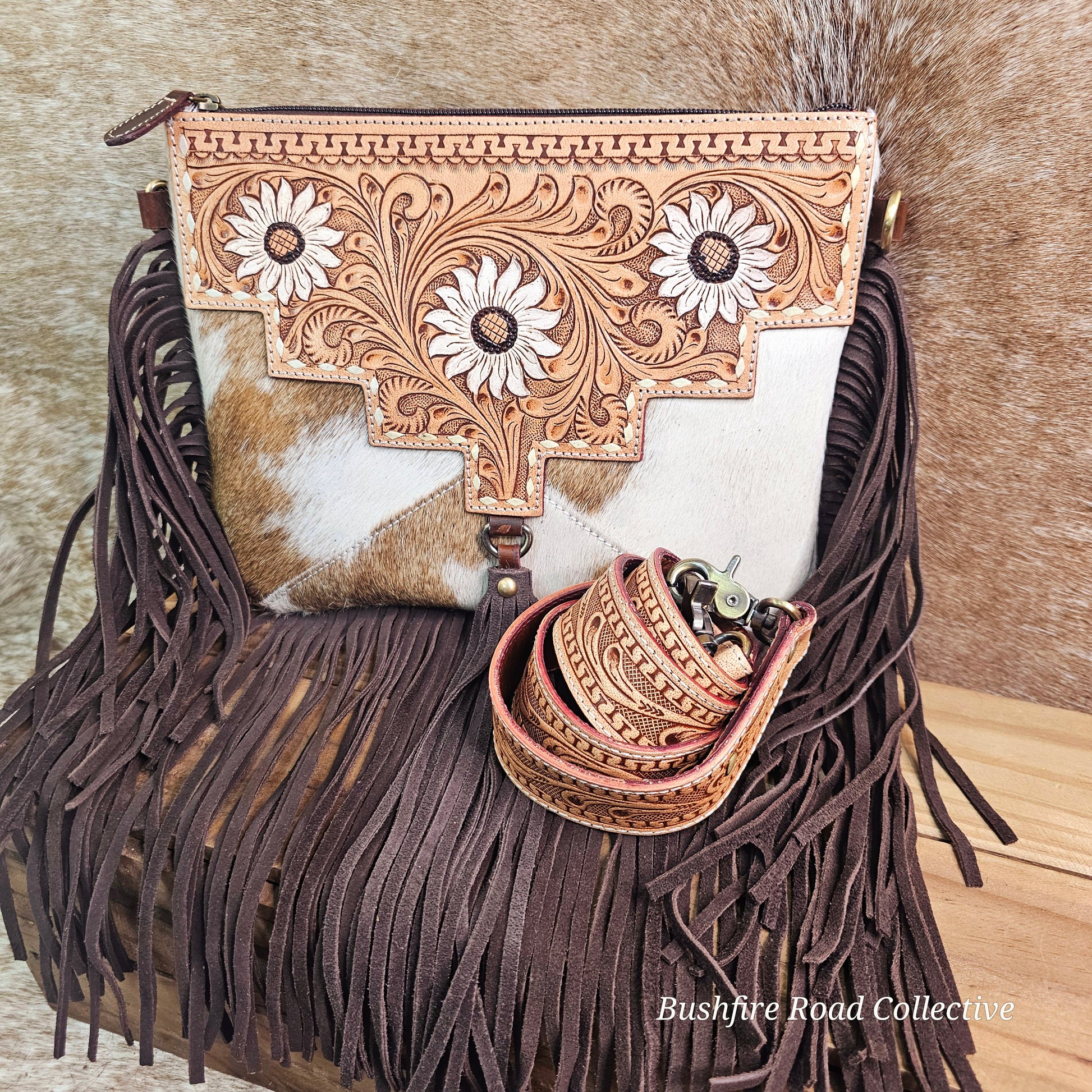 daisy ridge cowhide bag set, western bag and wallet set, tooled leather daisy purse, cowhide crossbody australia, fringe western handbag, boho cowgirl bag set, daisy tooled wallet, premium cowhide handbag, bushfire road collective bag, western accessories australia