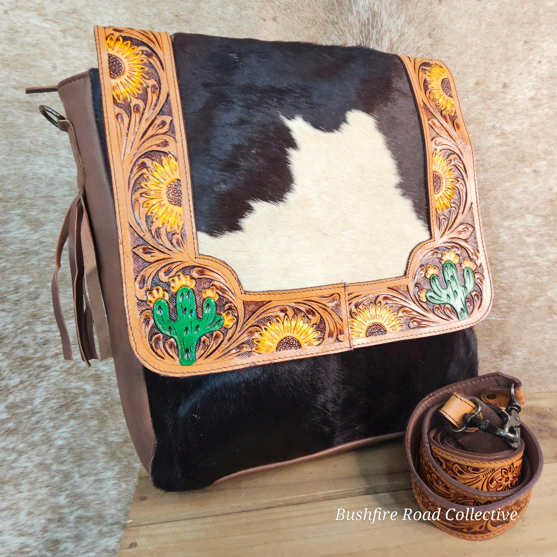Kalahari shoulder bag, cowhide leather shoulder bag, Western leather bag Australia, tooled leather cowhide bag, cactus leather handbag, sunflower tooled leather bag, Bushfire Road Collective bag, Western boho shoulder bag, genuine leather cowhide handbag, Western festival bag, outback leather bag, statement cowhide bag