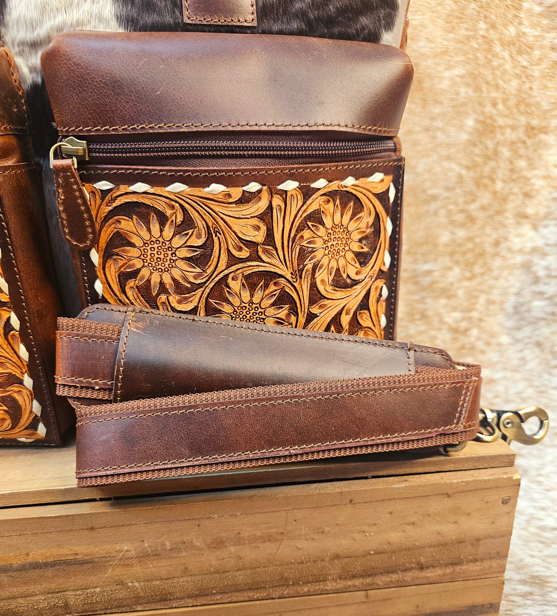 The Maggie Weekender is the ultimate all-rounder: built for the open road, the daily grind, or a spontaneous getaway. Featuring striking hand-tooled leather panels, buttery soft cowhide, and enough room to carry your essentials (and then some), this piece is made for those who live life boldly.