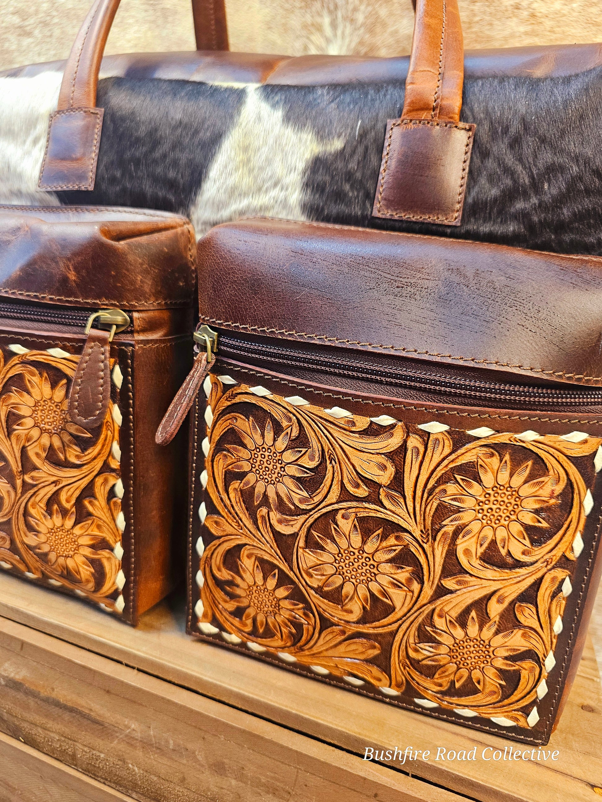 cowhide weekender bag, leather travel tote, western duffle bag Australia, Maggie cowhide shoulder bag, Bushfire Road Collective bags, cowgirl overnight bag, tooled leather travel bag, weekend getaway cowhide duffle, rustic cowhide accessories, handcrafted leather and hide bag