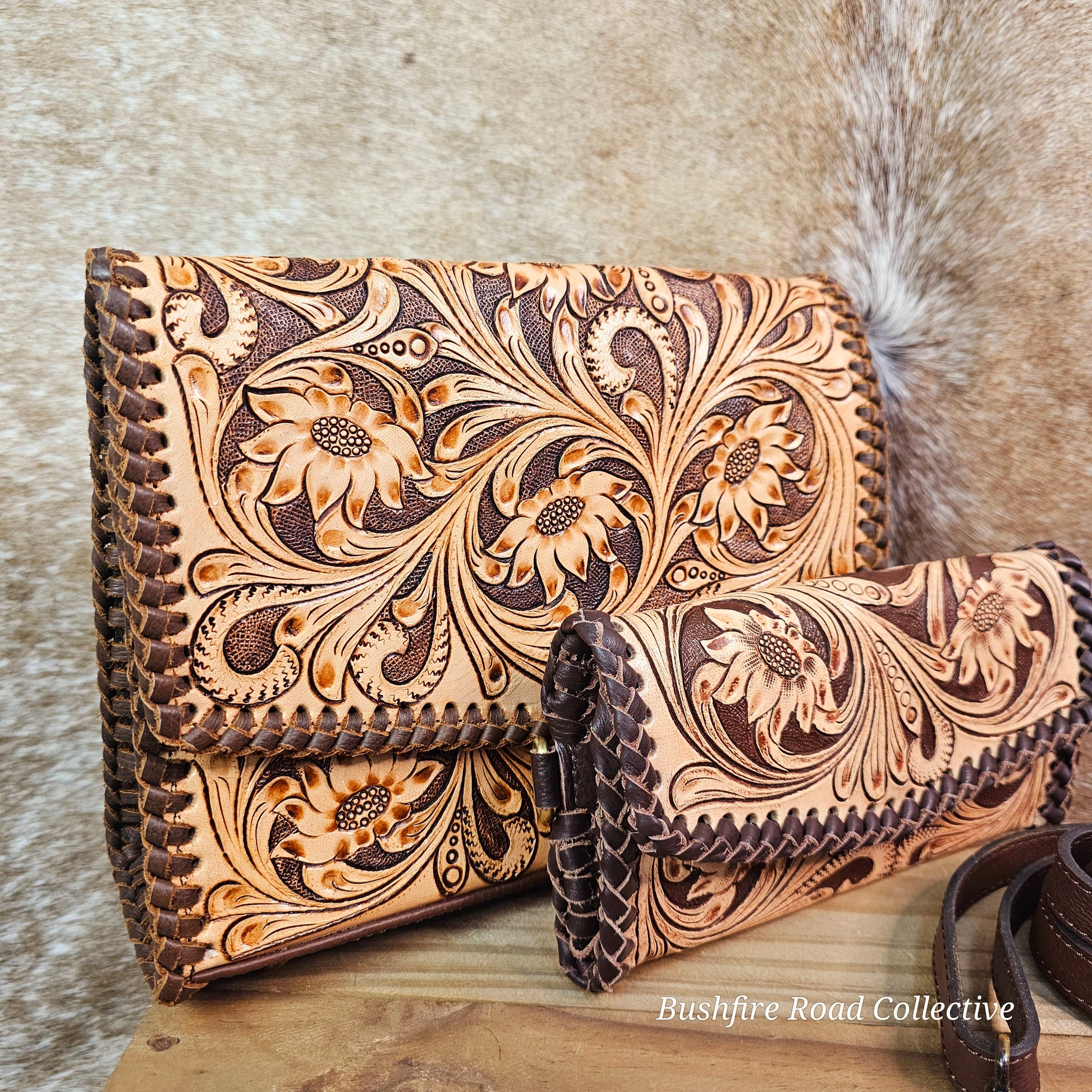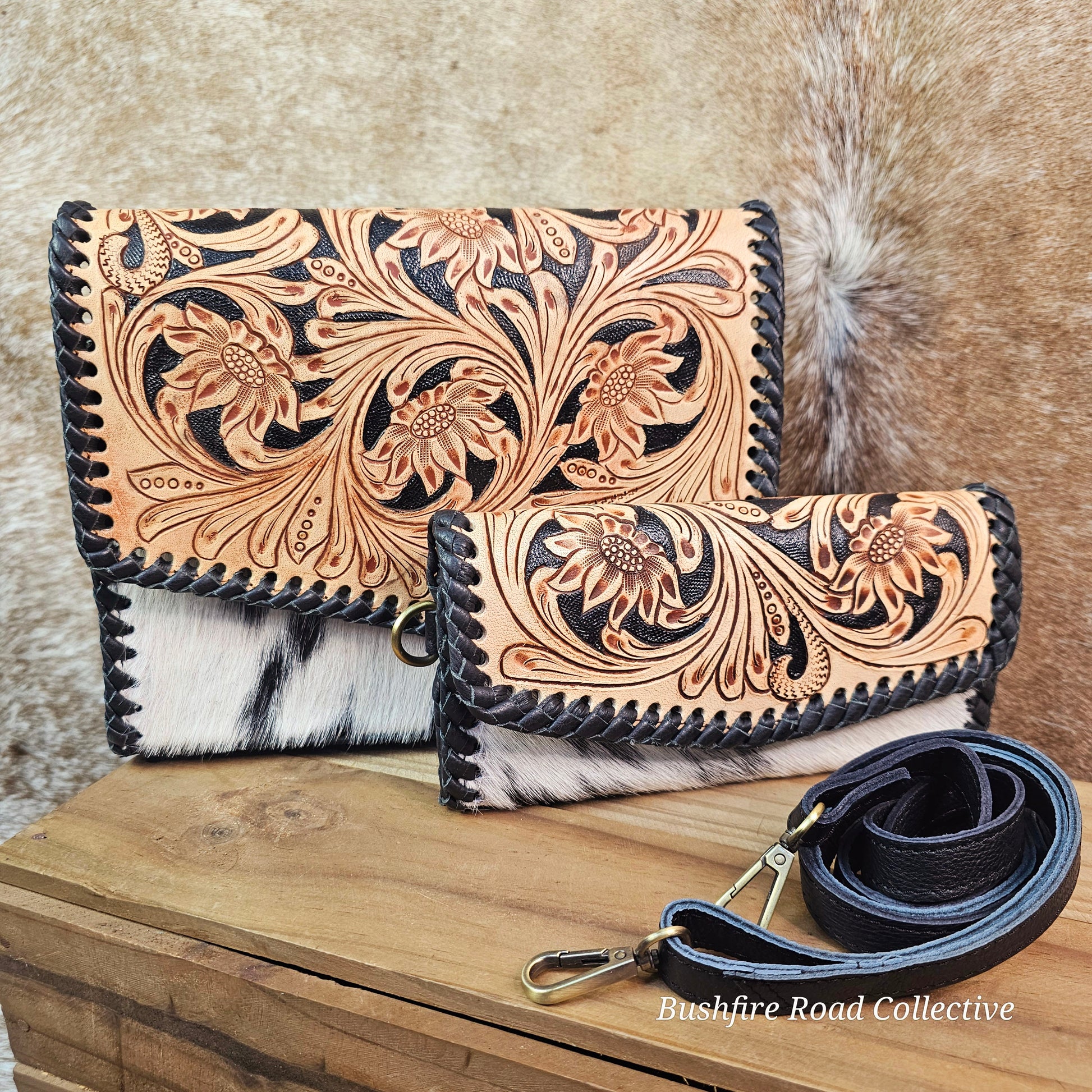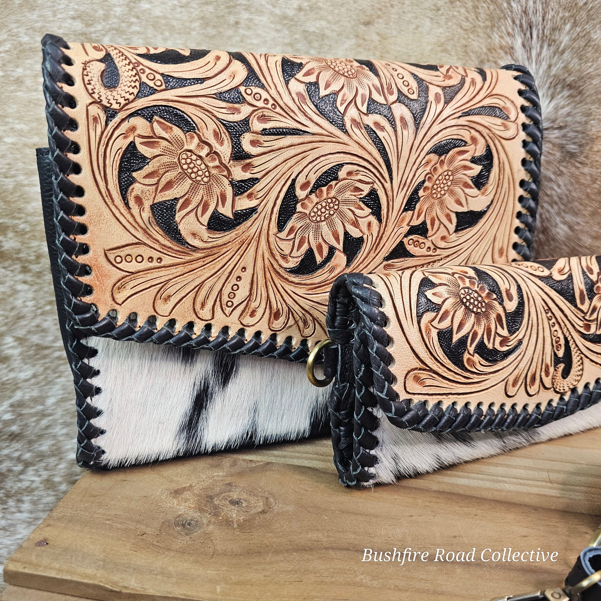 Where wild meets refined. The Sunflower Ridge Hide Set captures the Western soul — bold genuine cowhide, a hand-tooled floral flap, crisp buckstitch edging, and long fringe that moves with you. Each set includes a matching crossbody bag and wallet, both one-of-a-kind and crafted from unique hide patterns that make your pieces truly yours. Finished with an adjustable strap and secure magnetic closure, it’s ready to take you from saddle to city in unmistakable Bushfire Road style.