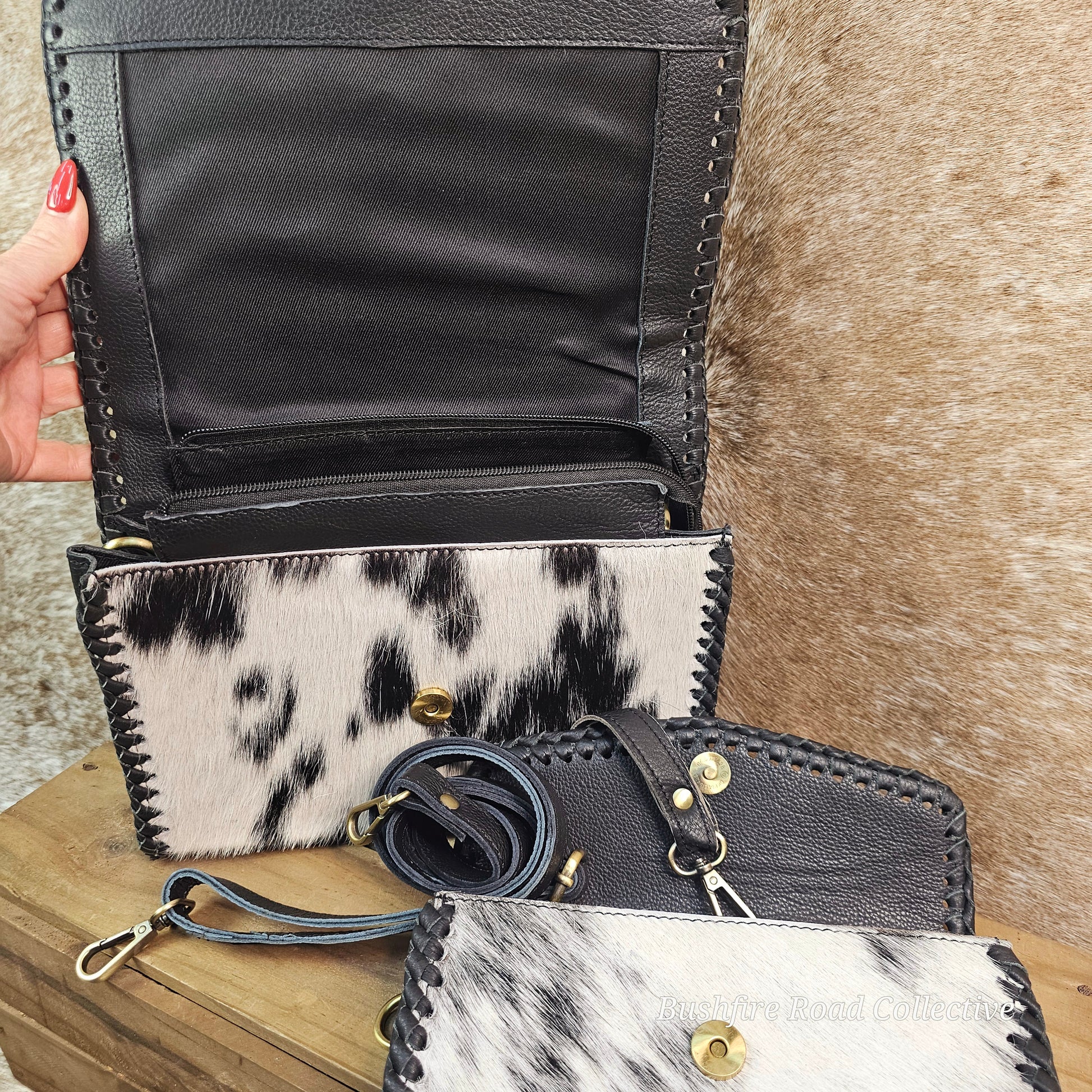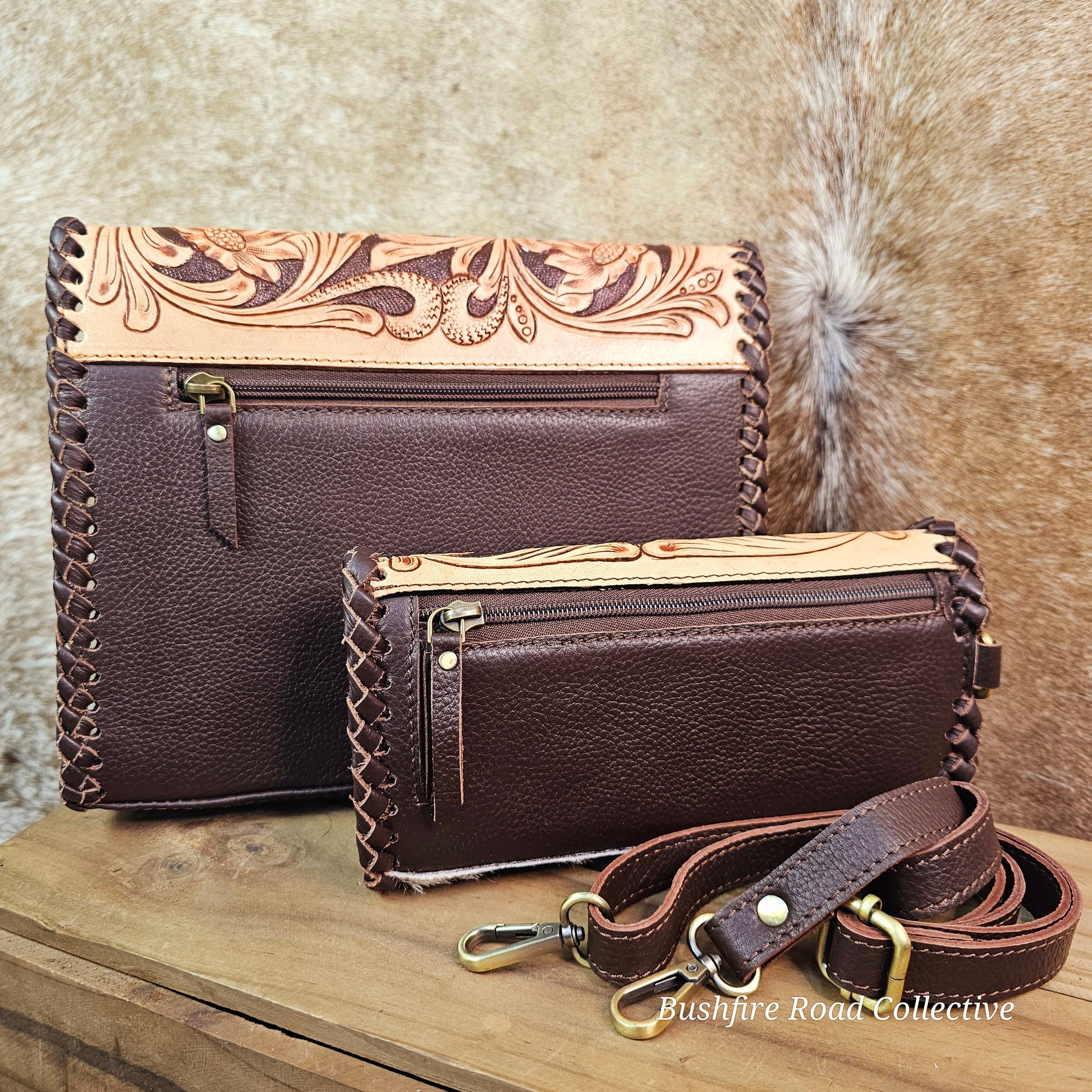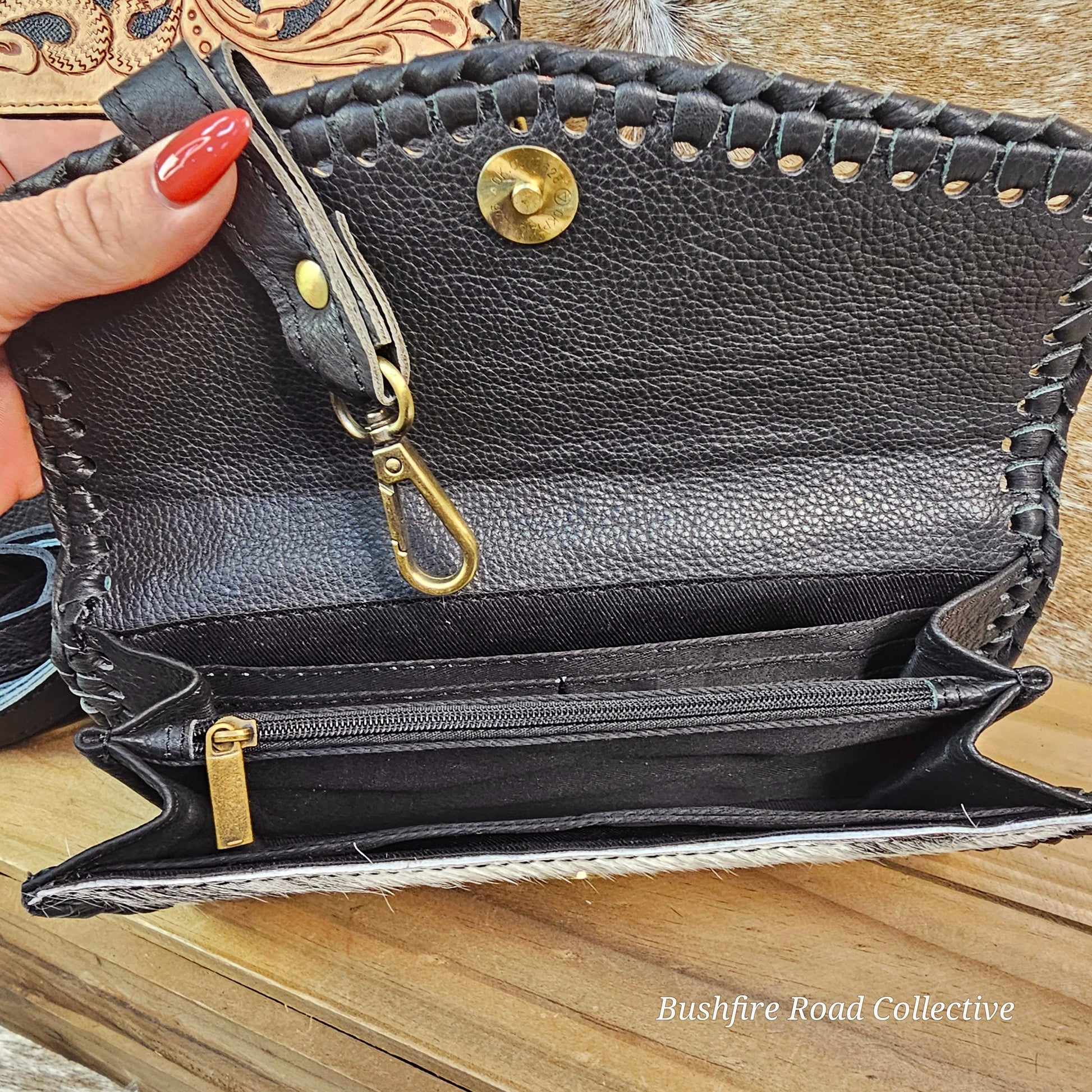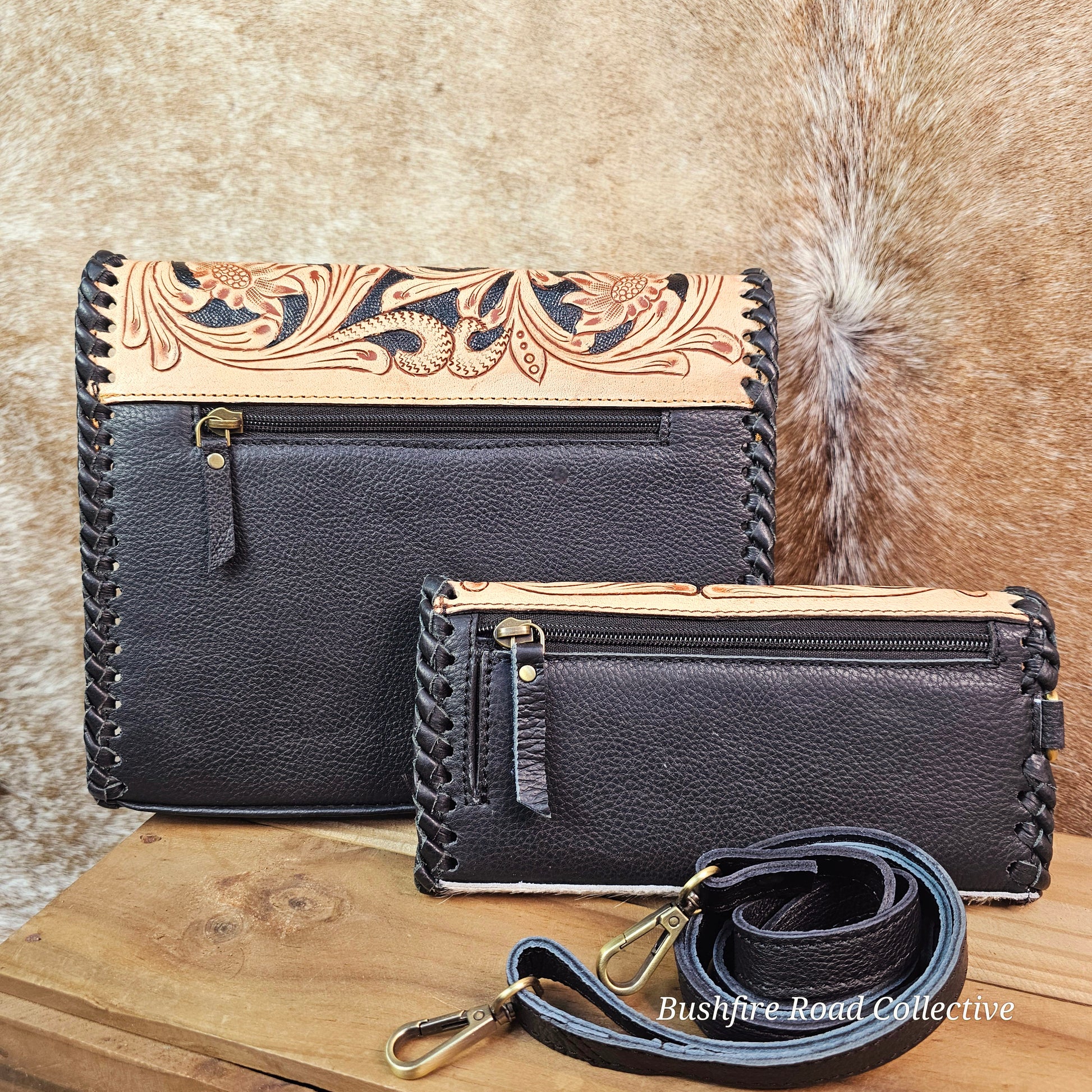 Where wild meets refined. The Sunflower Ridge Hide Set captures the Western soul — bold genuine cowhide, a hand-tooled floral flap, crisp buckstitch edging, and long fringe that moves with you. Each set includes a matching crossbody bag and wallet, both one-of-a-kind and crafted from unique hide patterns that make your pieces truly yours. Finished with an adjustable strap and secure magnetic closure, it’s ready to take you from saddle to city in unmistakable Bushfire Road style.