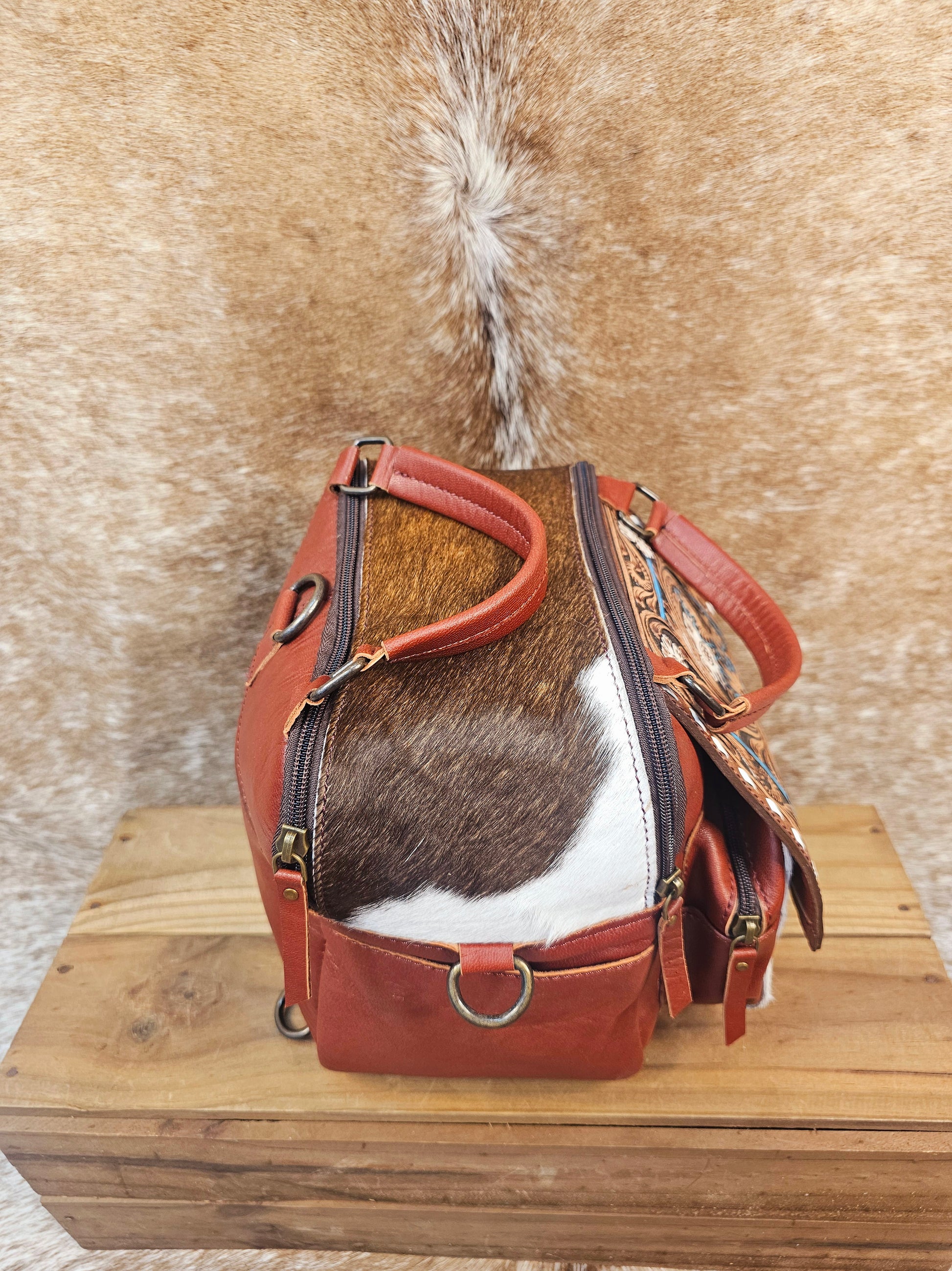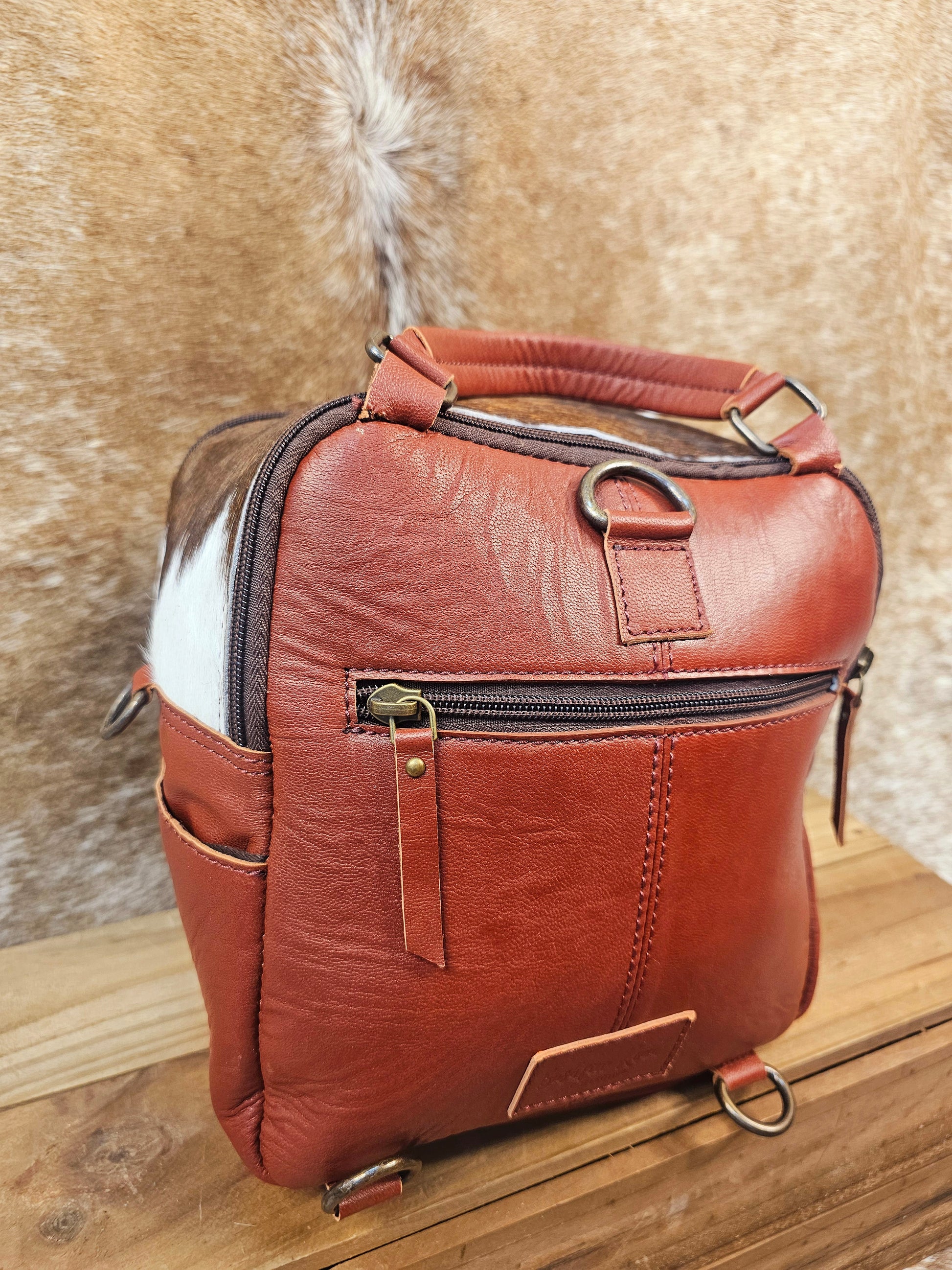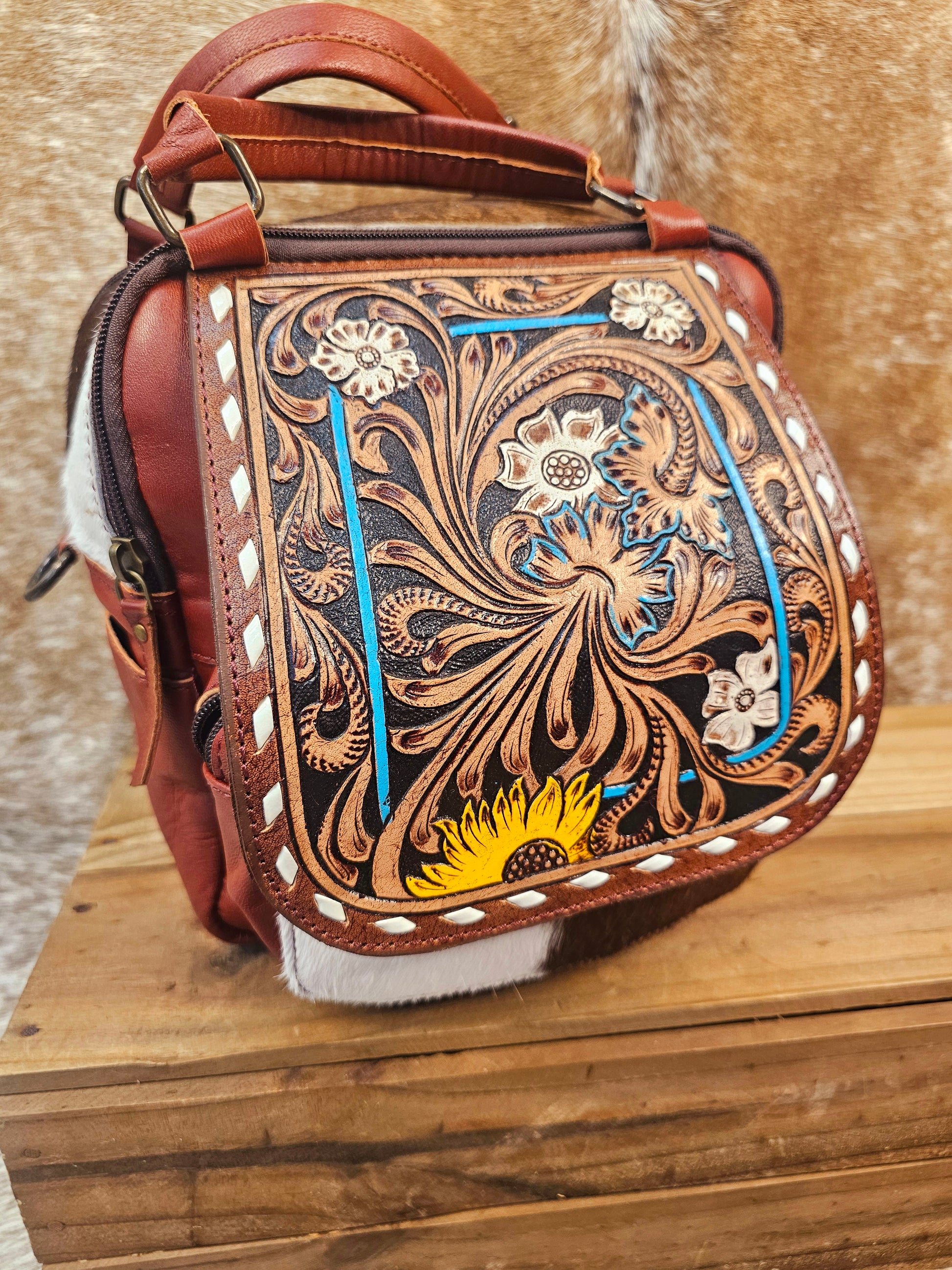 convertible cowhide bag, sunflower tooled leather bag, western mini backpack Australia, 3-in-1 leather bag, cowhide crossbody duffel, boho western backpack, bushfire road bags, country cowhide accessories, gypsy style leather backpack, rustic western convertible purse