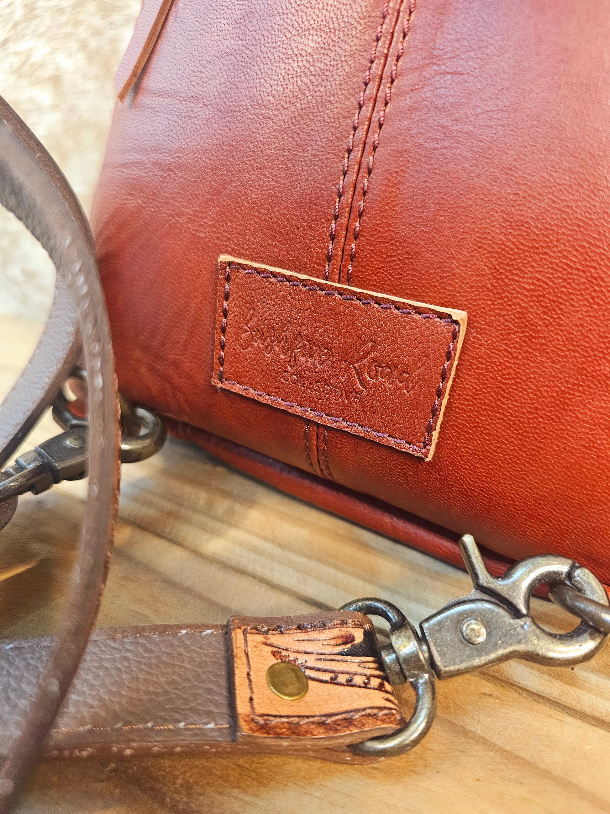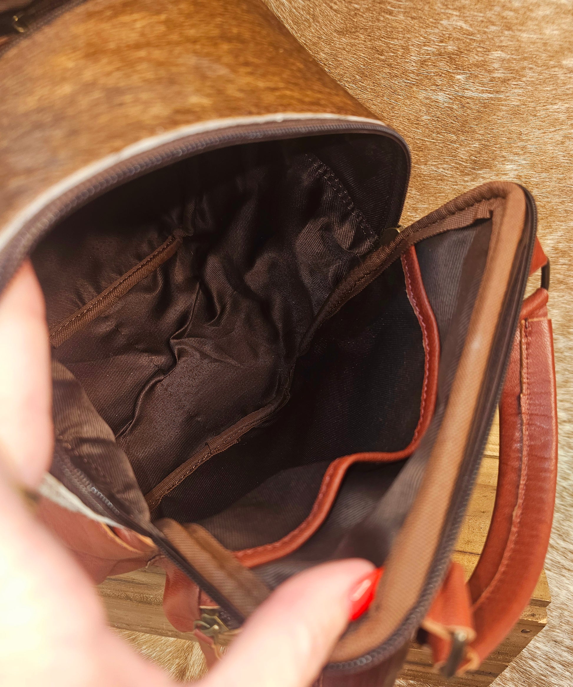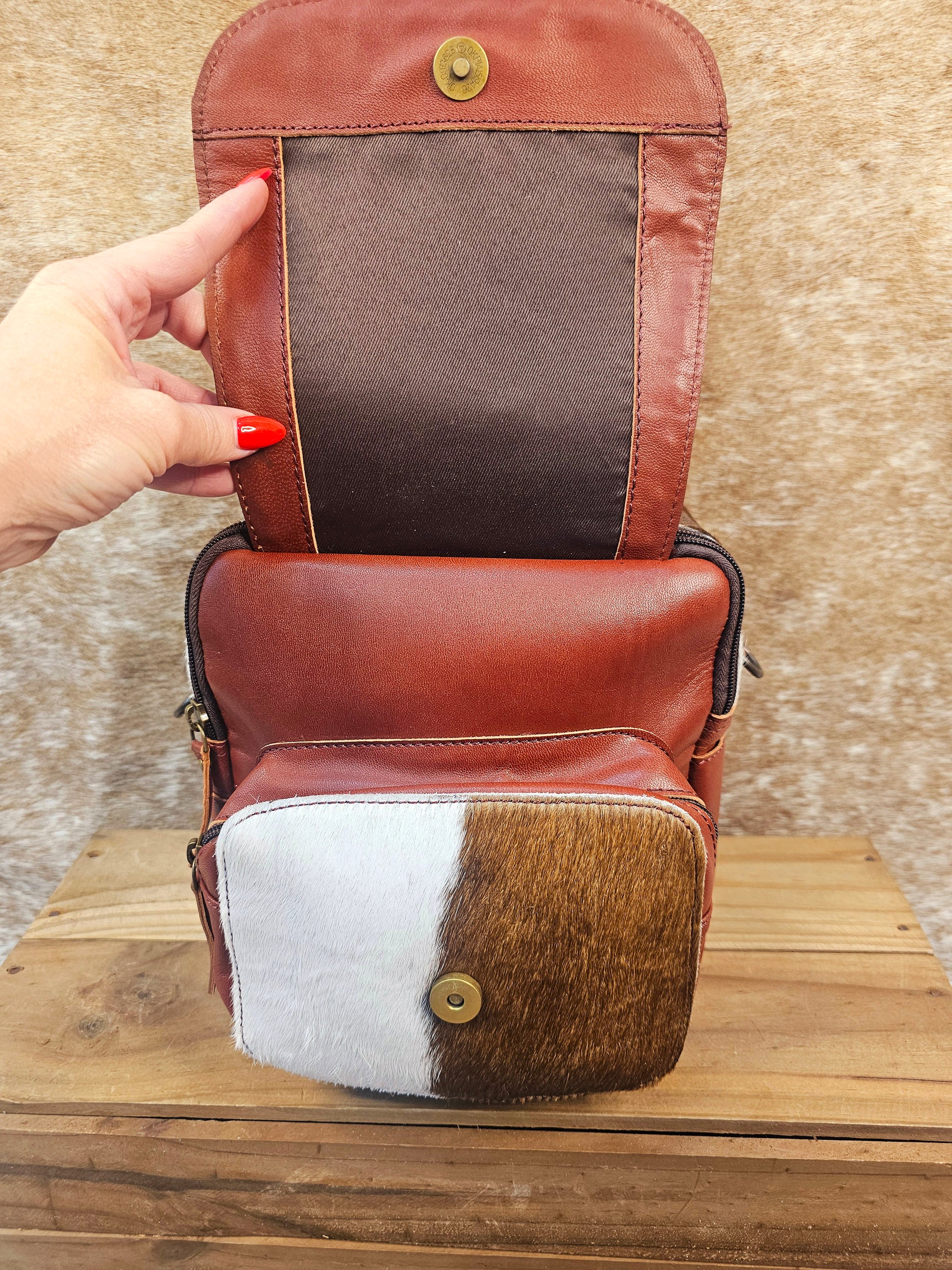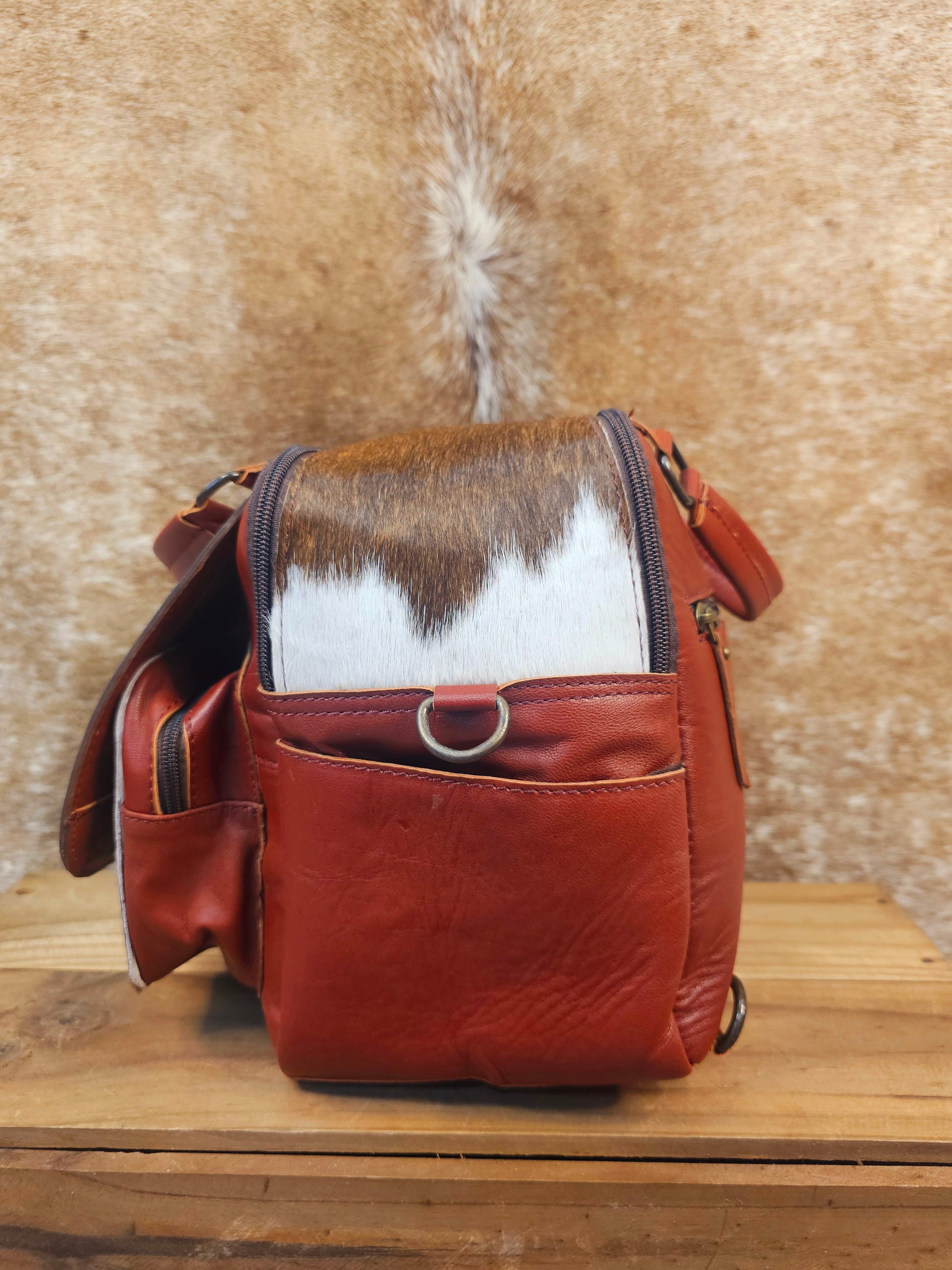 convertible cowhide bag, sunflower tooled leather bag, western mini backpack Australia, 3-in-1 leather bag, cowhide crossbody duffel, boho western backpack, bushfire road bags, country cowhide accessories, gypsy style leather backpack, rustic western convertible purse