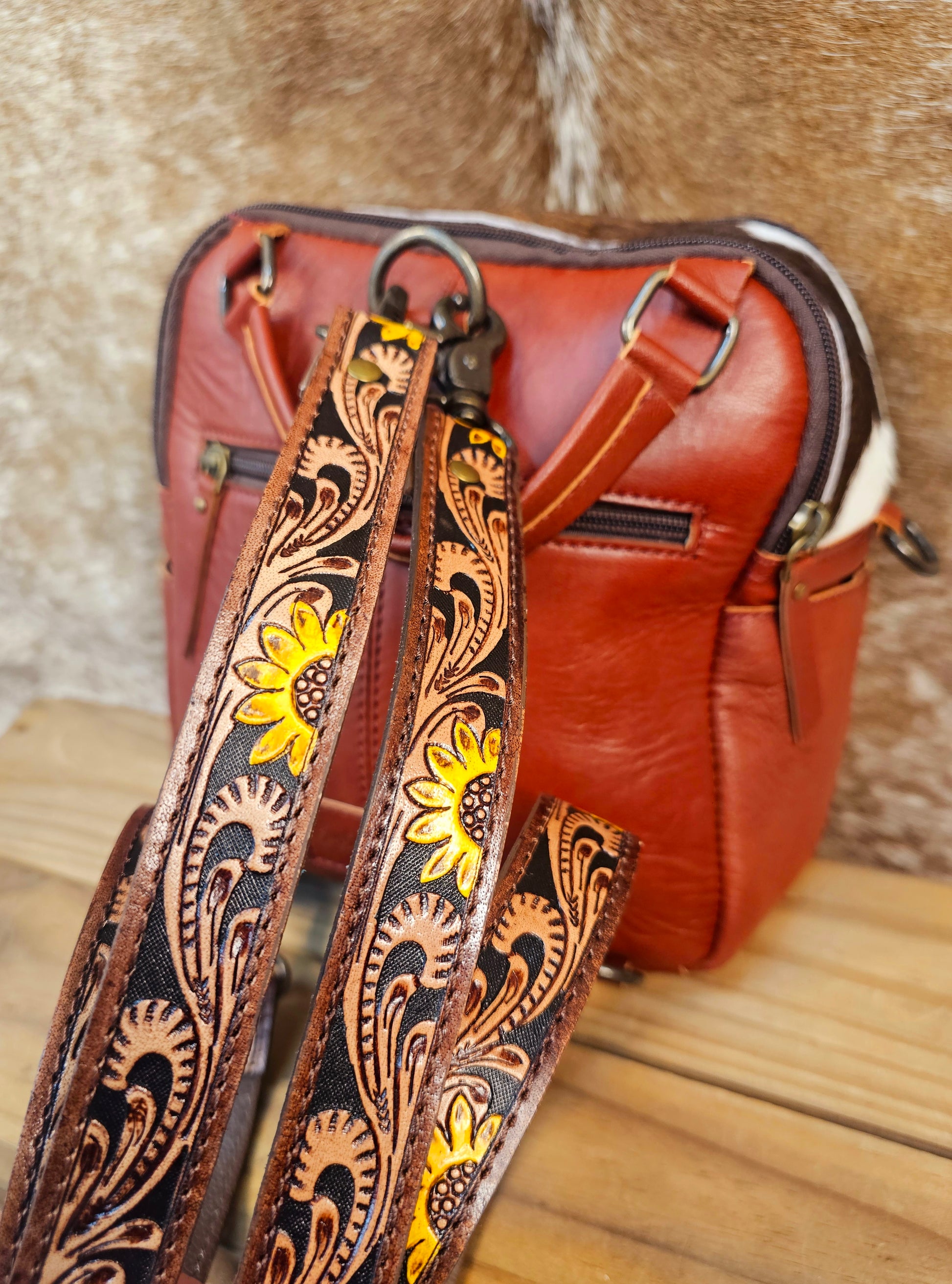 Versatile, bold and handcrafted to impress, the Sunflower Trails Convertible Mini is your new go-to for effortless western style. Designed with rich tan leather and genuine cowhide panels, it features a hand-tooled sunflower floral front with turquoise accents—an ode to wildflowers and wide open skies.
